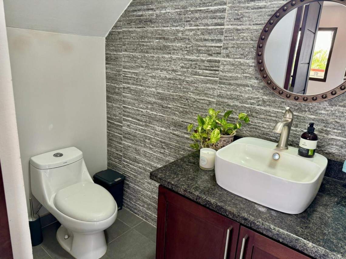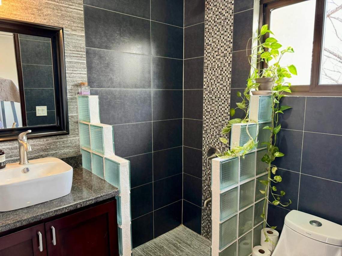 Outside, the property is adorned with conveniences like an electric gate, automatic sprinkler system, and exterior lighting, enhancing security and convenience. The mature gardens add a touch of natural beauty, complemented by a gas BBQ area perfect for outdoor gatherings. The highlight of this property is the expansive pool with an infinity edge and a cascading waterfall, inviting you to relax and unwind in style. Situated just a 2-3 minute drive from Playa Grande beach, renowned for its world-class surfing, this location offers the best of coastal living and recreation.