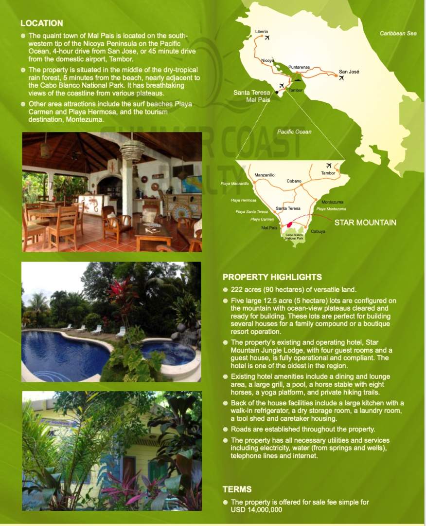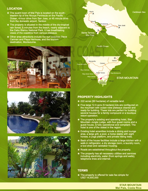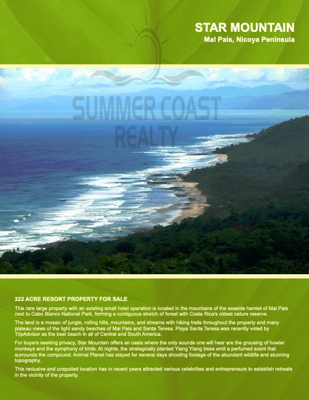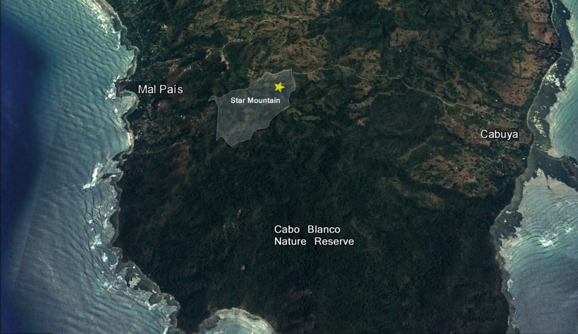 222-acre jungle oasis in the mountains of Mal Pais, the most exclusive neighborhood in Costa Rica. The extensive land forms a contiguous stretch of forest with Cabo Blanco National Park, Costa Rica’s oldest nature reserve. Star Mountain is a lush mosaic of jungle, rolling hills, mountains, streams and hiking trails with many plateau views of the light sandy beaches