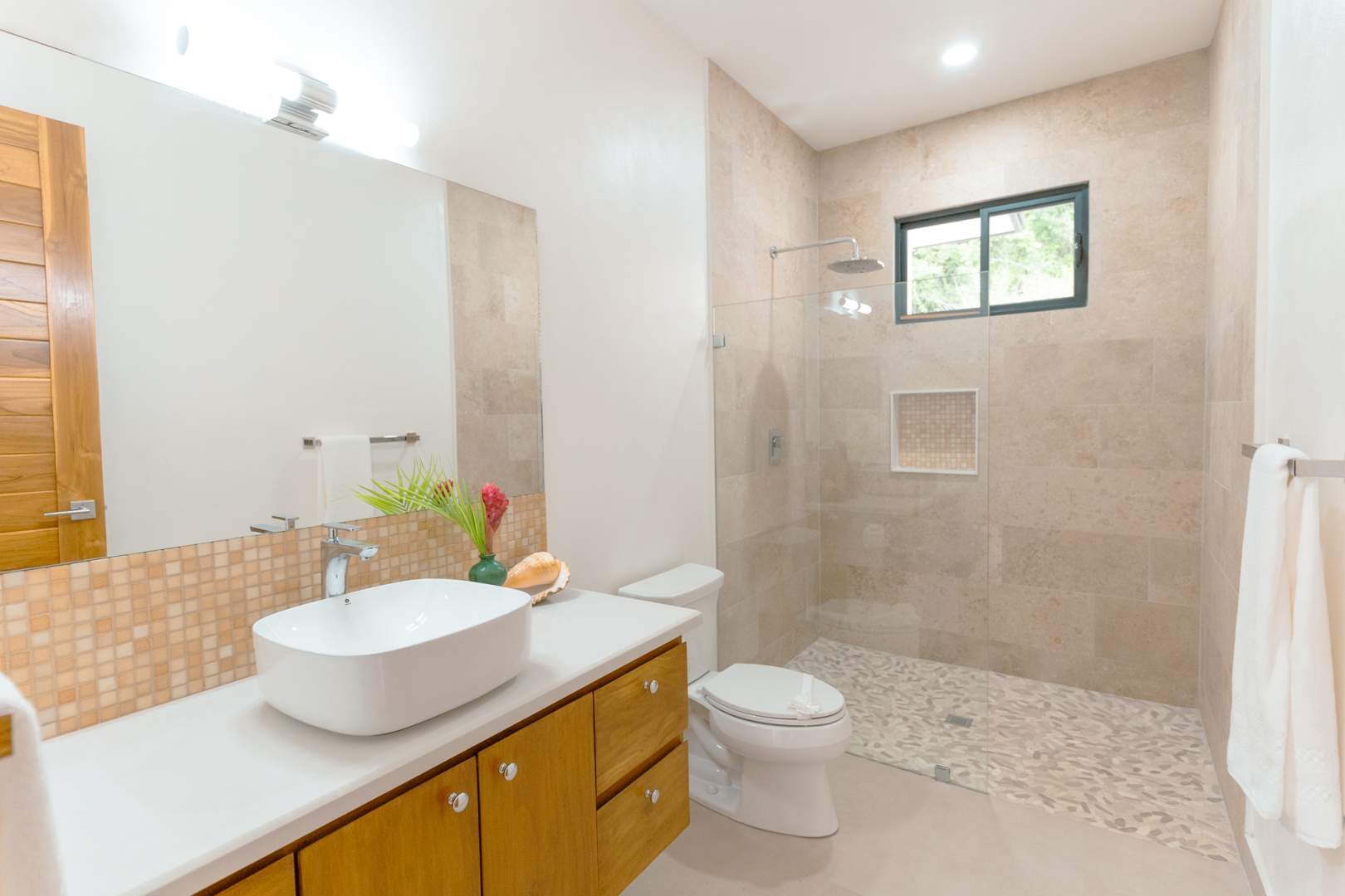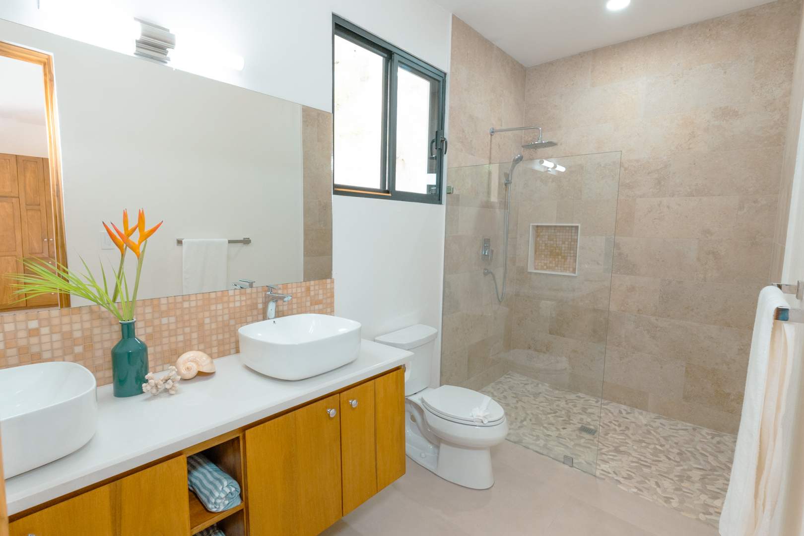 Three large bedrooms are complimented by three large bathrooms, all with high pressure showers and custom made teak cabinetry. The ceilings are high and the rooms are amply cooled by split unit air conditioning and fans. There is a separate bodega housing the pool equipment which provides storage for beach toys and bikes.