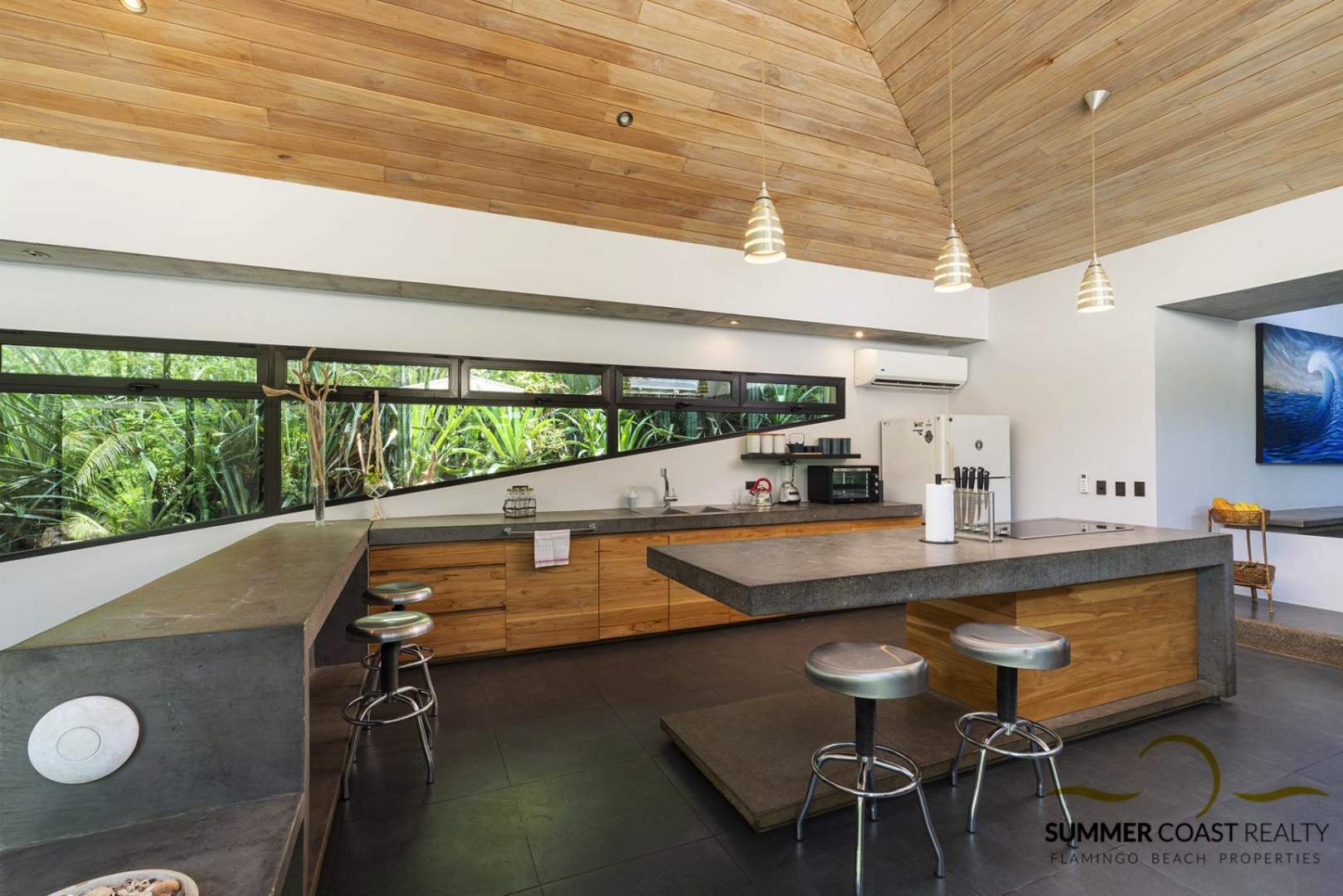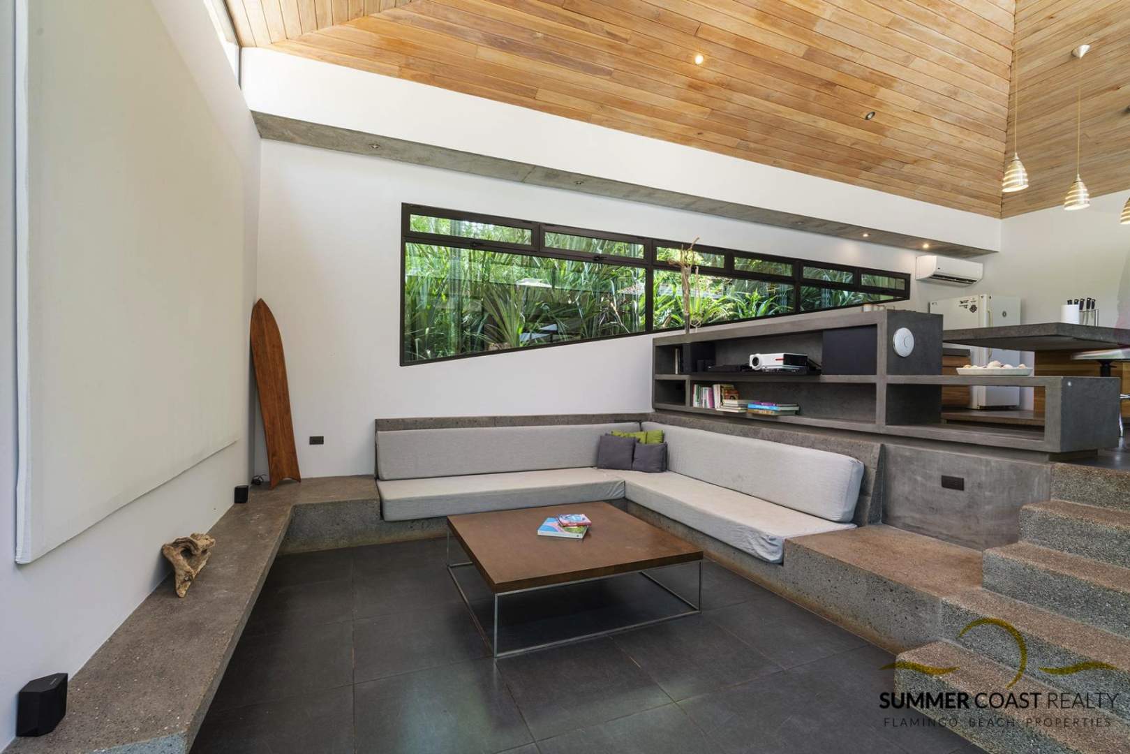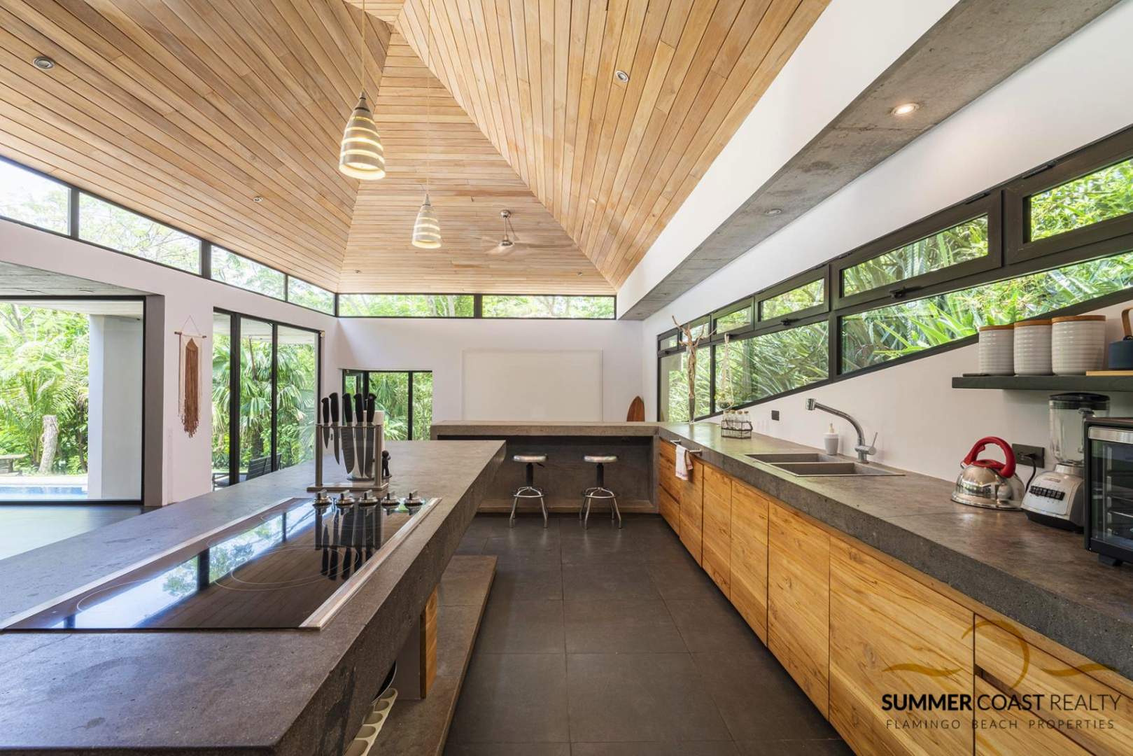 The stunning custom kitchen offers a massive island ideal for entertaining your guests. The dining and living room opens up to the pool and lush outdoors which brings you closer to nature and roots you in the beauty of the present moment. Additionally, there is a TV/entertainment area with a projector to enjoy your favorite movies.