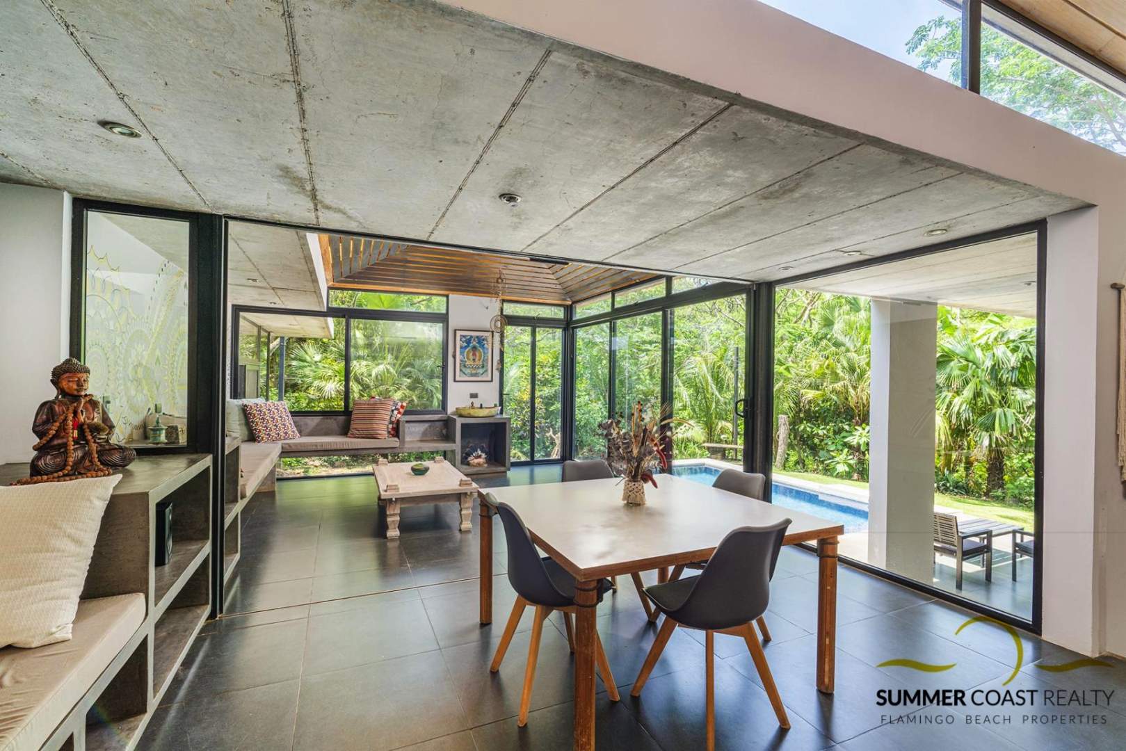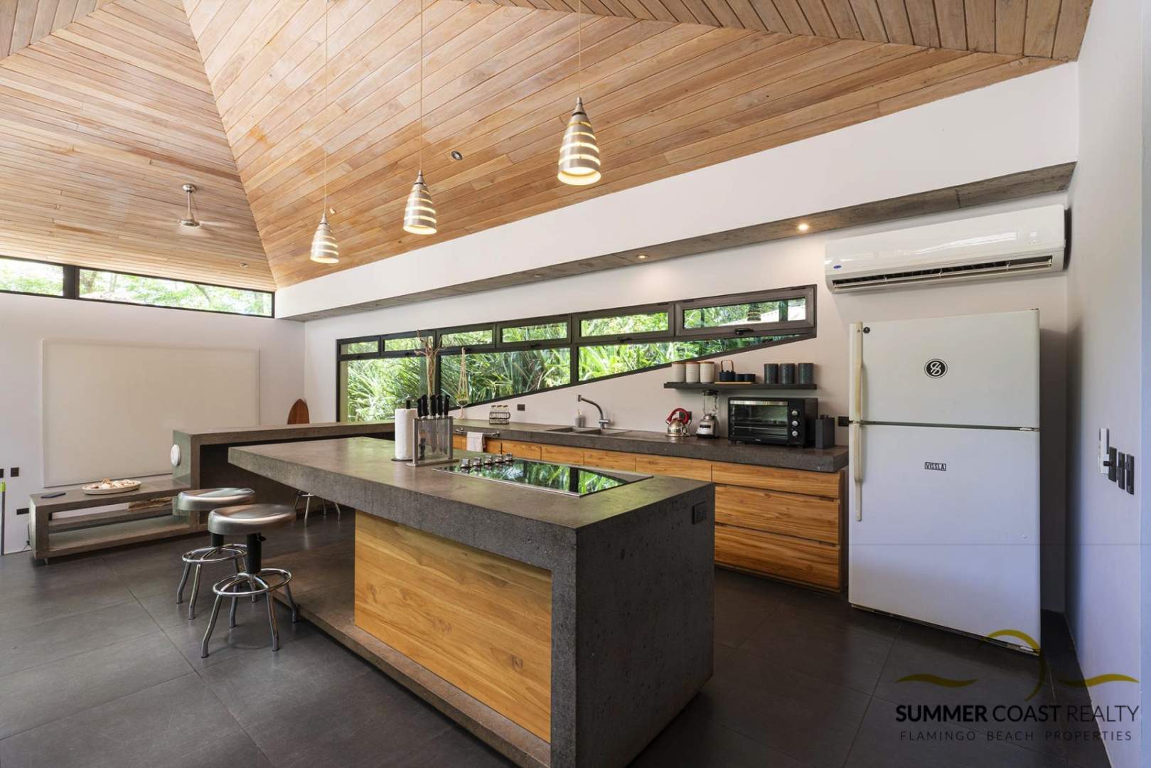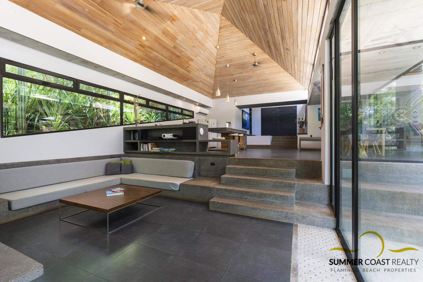 The stunning custom kitchen offers a massive island ideal for entertaining your guests. The dining and living room opens up to the pool and lush outdoors which brings you closer to nature and roots you in the beauty of the present moment. Additionally, there is a TV/entertainment area with a projector to enjoy your favorite movies.
