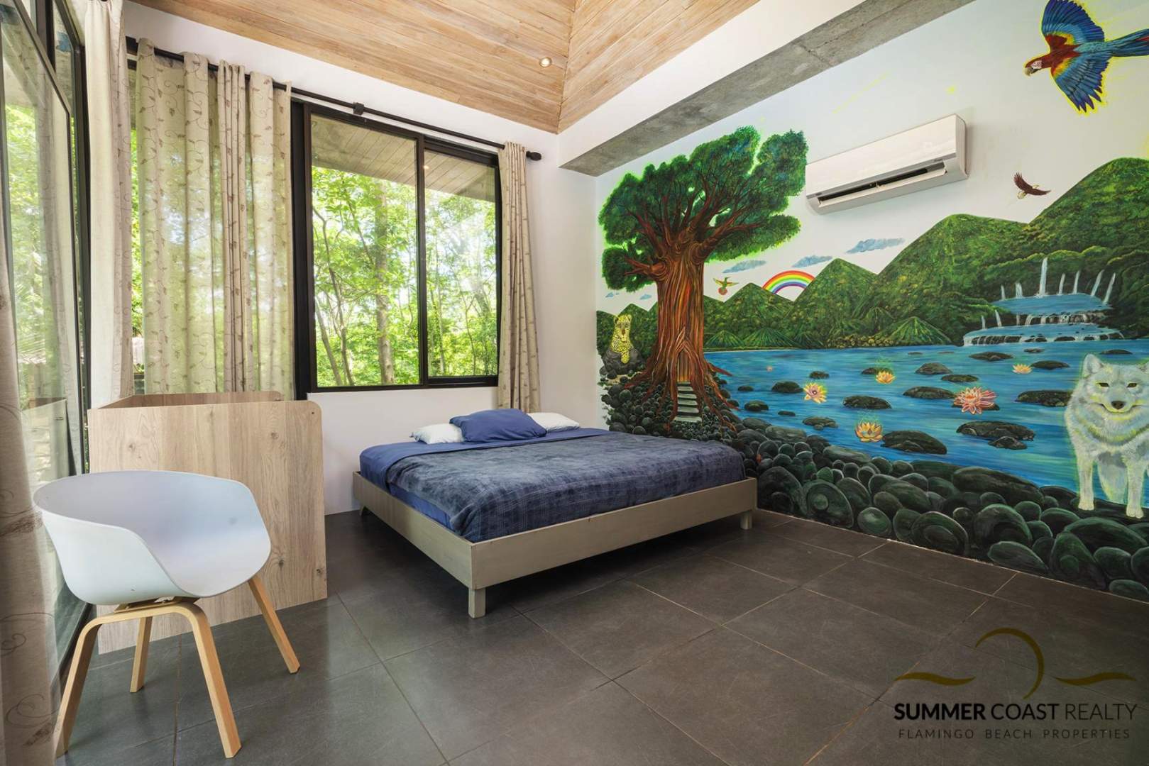 The guest bedroom provides ample space for guests, with views gorgeous views of the outdoors and is located just next to the second full bathroom.