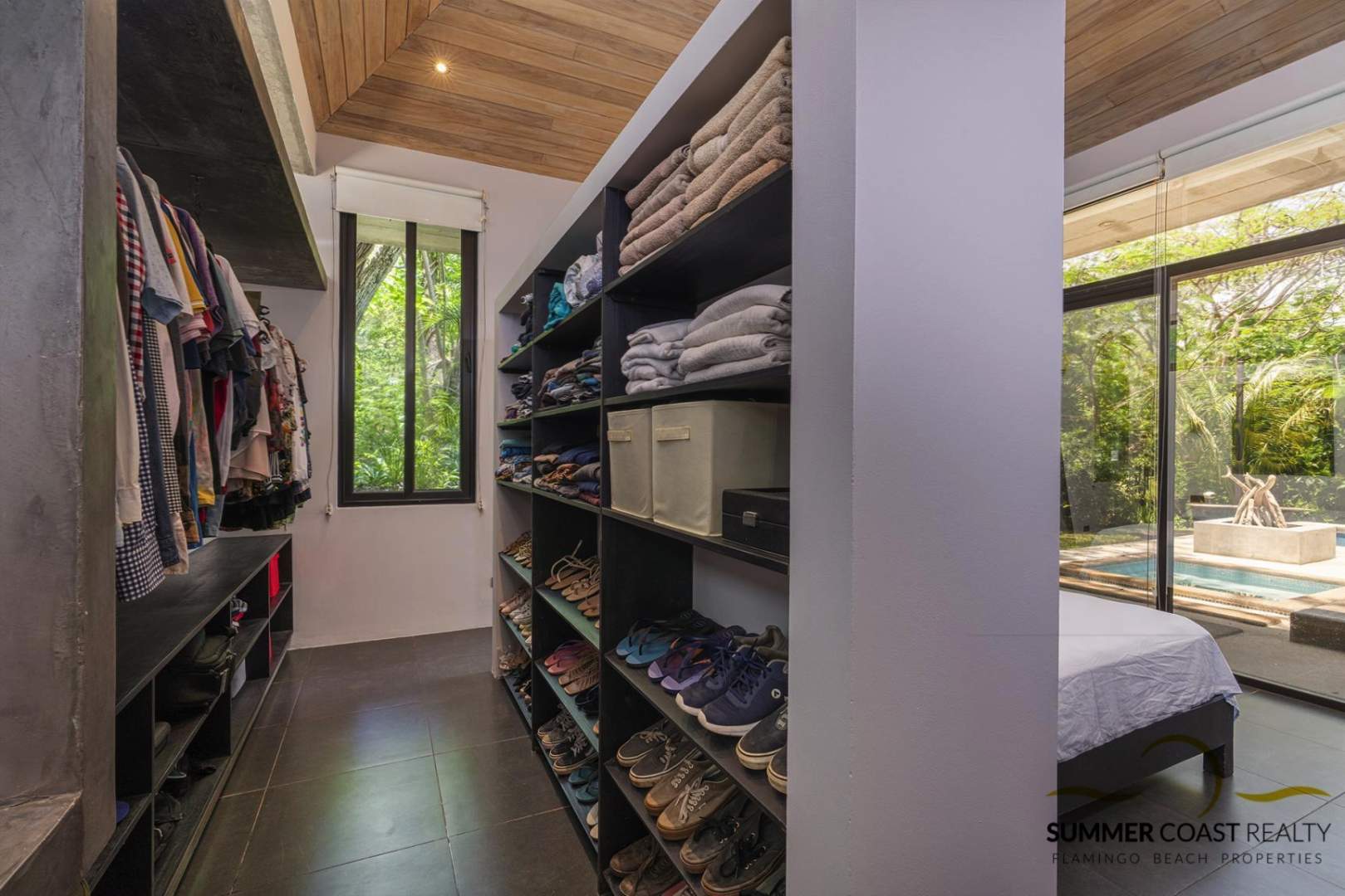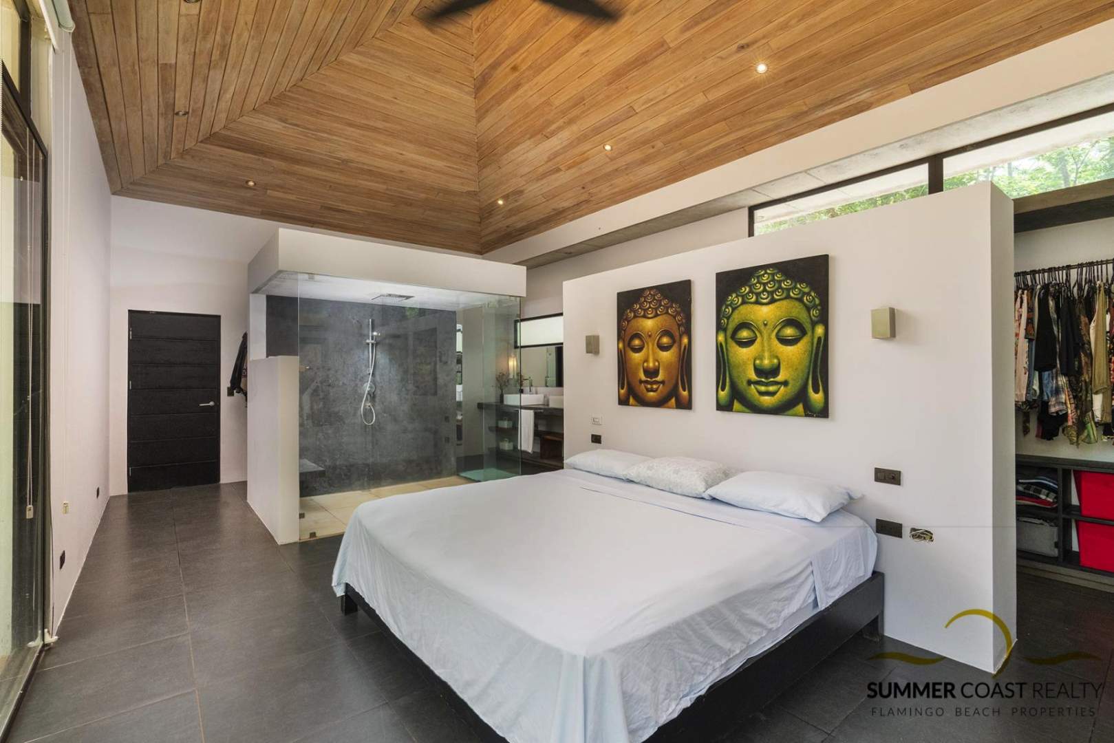 The master bedroom that overlooks the pool offers a gorgeous ensuite bathroom with an oversized glass walk-in shower & his & her sinks. You will also find behind the headboard a beautiful and large custom his & her closet.
