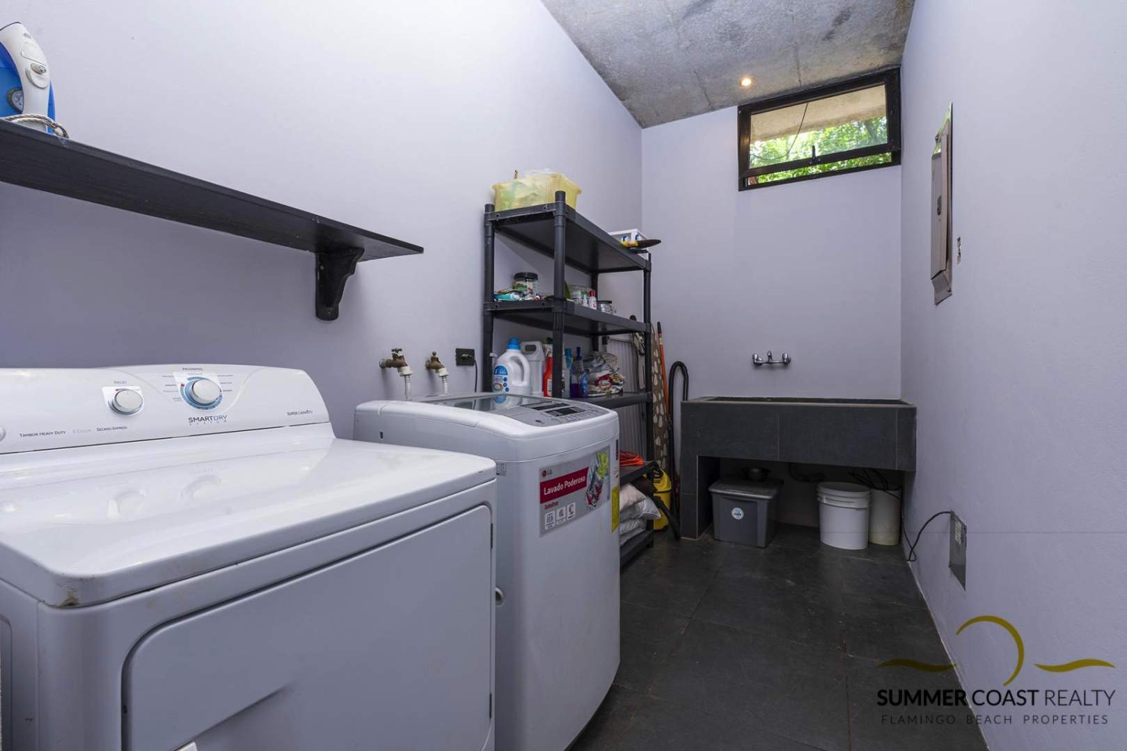 Each room is equipped with air conditioning and the home comes fully furnished (with the exception of a few personal items ) and equipped with all appliances & systems as seen in the pictures. By the entrance door, you’ll find an office/ storage room and a complete laundry room that is conveniently located inside the house.