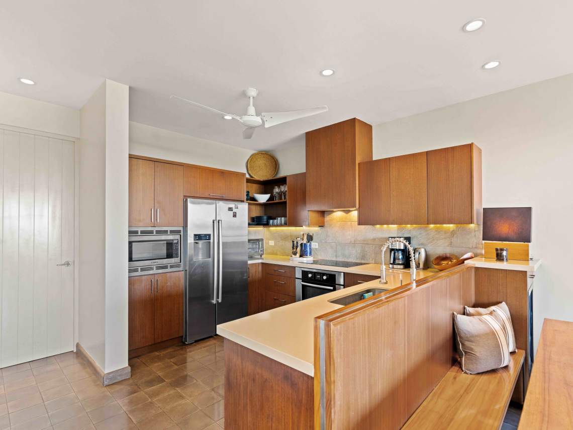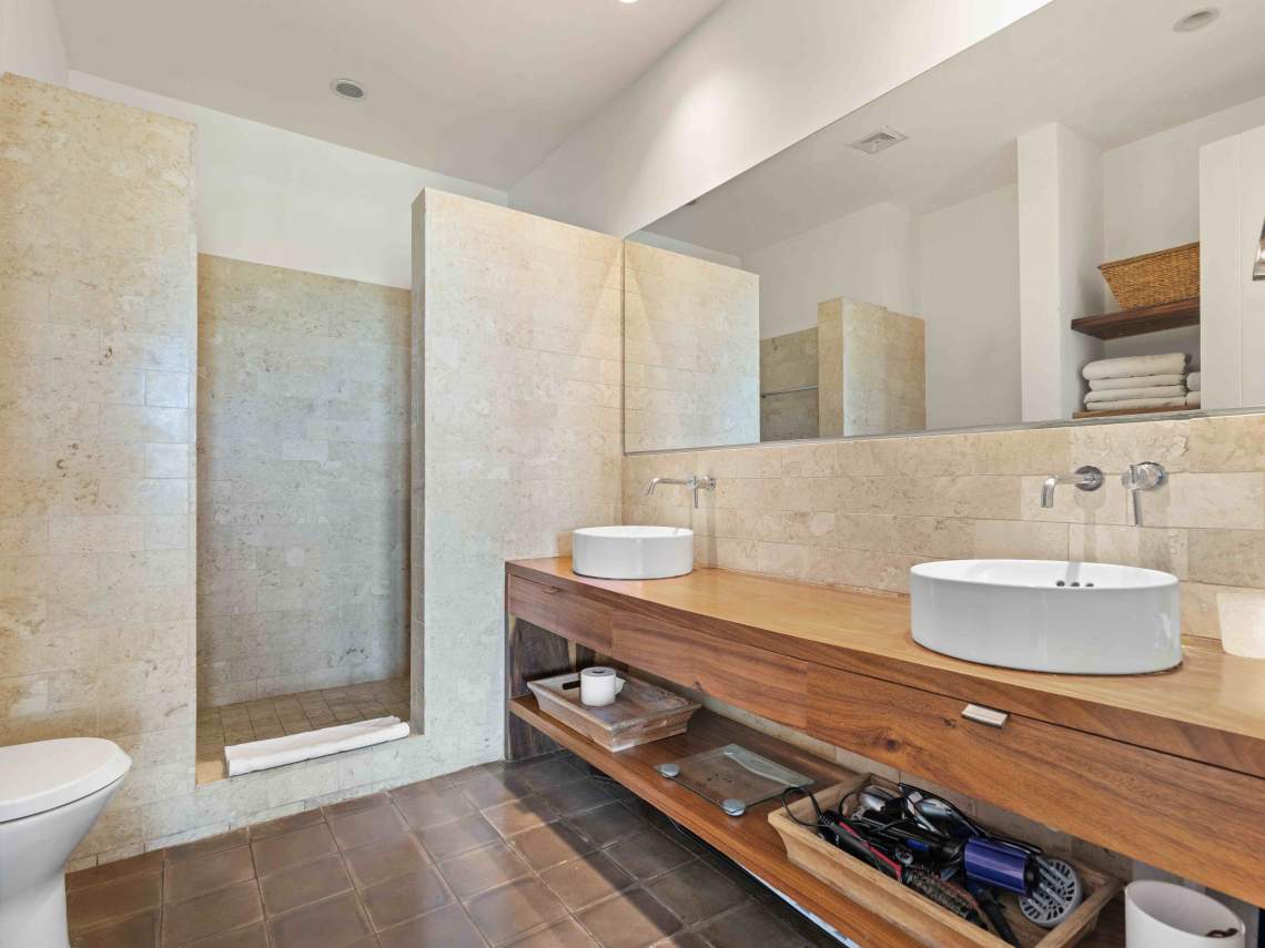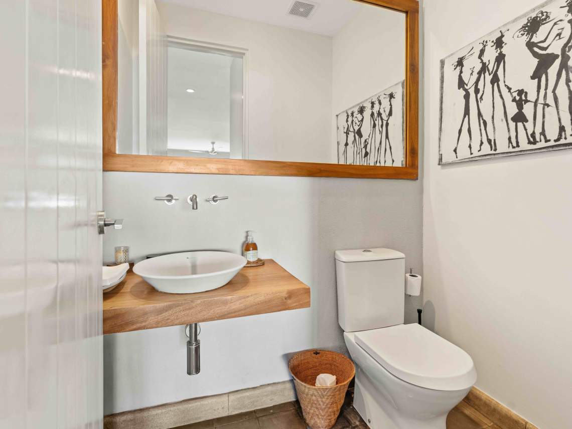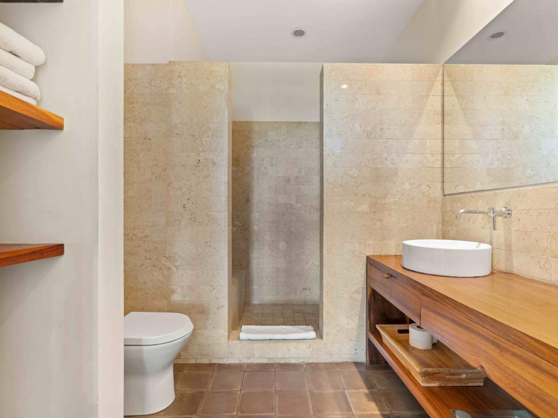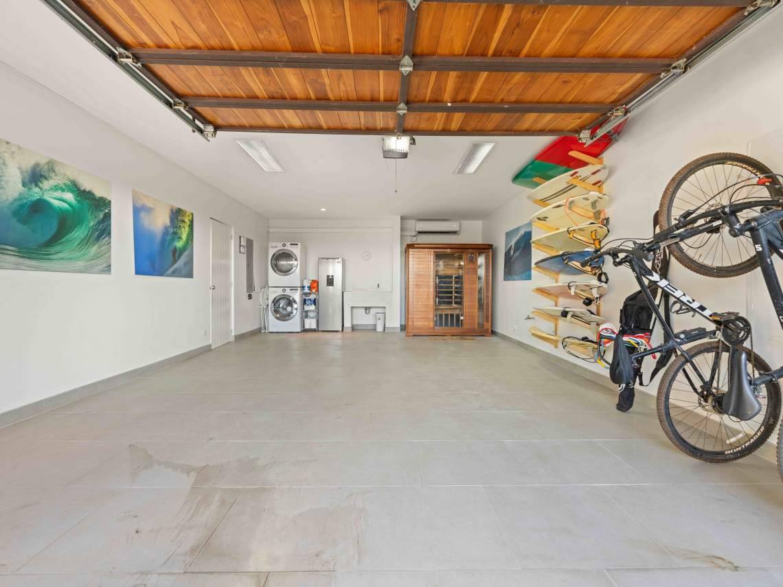 Inside, you get three big bedrooms, three and a half nice bathrooms, and a modern kitchen with fancy appliances. There are two big balconies where you can chill out and enjoy the amazing views. The villa has a cozy tropical vibe, with lots of local wood and stone finishes in the bathrooms. Plus, there’s a garage for two cars, a laundry room, good roads, underground utilities, and 24/7 security for peace of mind.