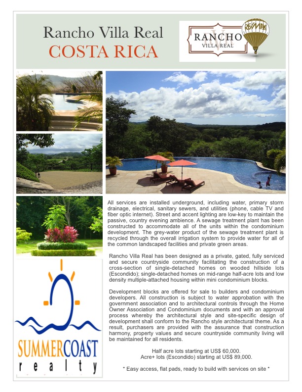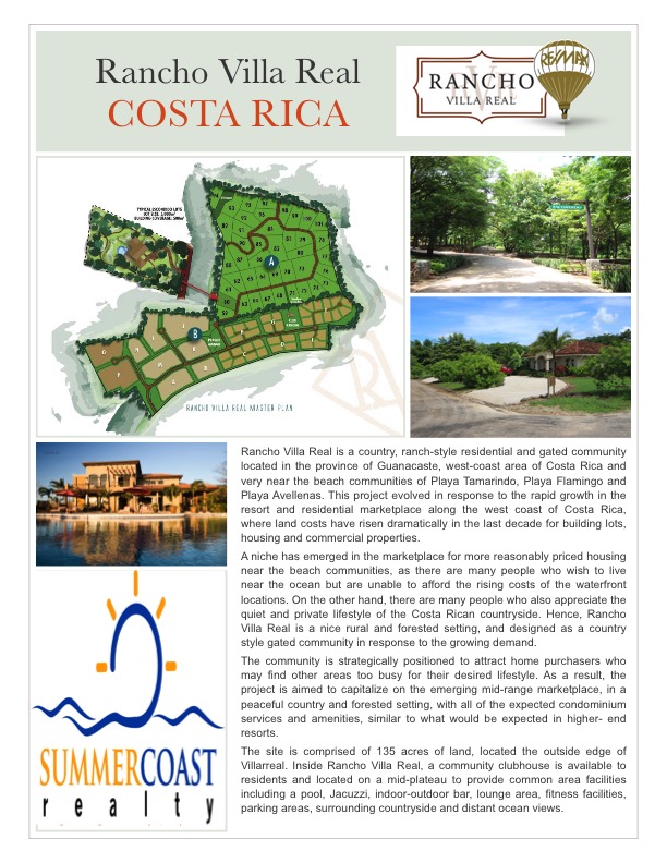 Rancho Villa Real is a country, ranch-style residential and gated community located in the province of Guanacaste, west-coast area of Costa Rica and very near the beach communities of Playa Tamarindo, Playa Flamingo and Playa Avellenas. This project evolved in response to the rapid growth in the resort and residential marketplace along the west coast of Costa Rica, where land costs have risen dramatically in the last decade for building lots, housing and commercial properties.