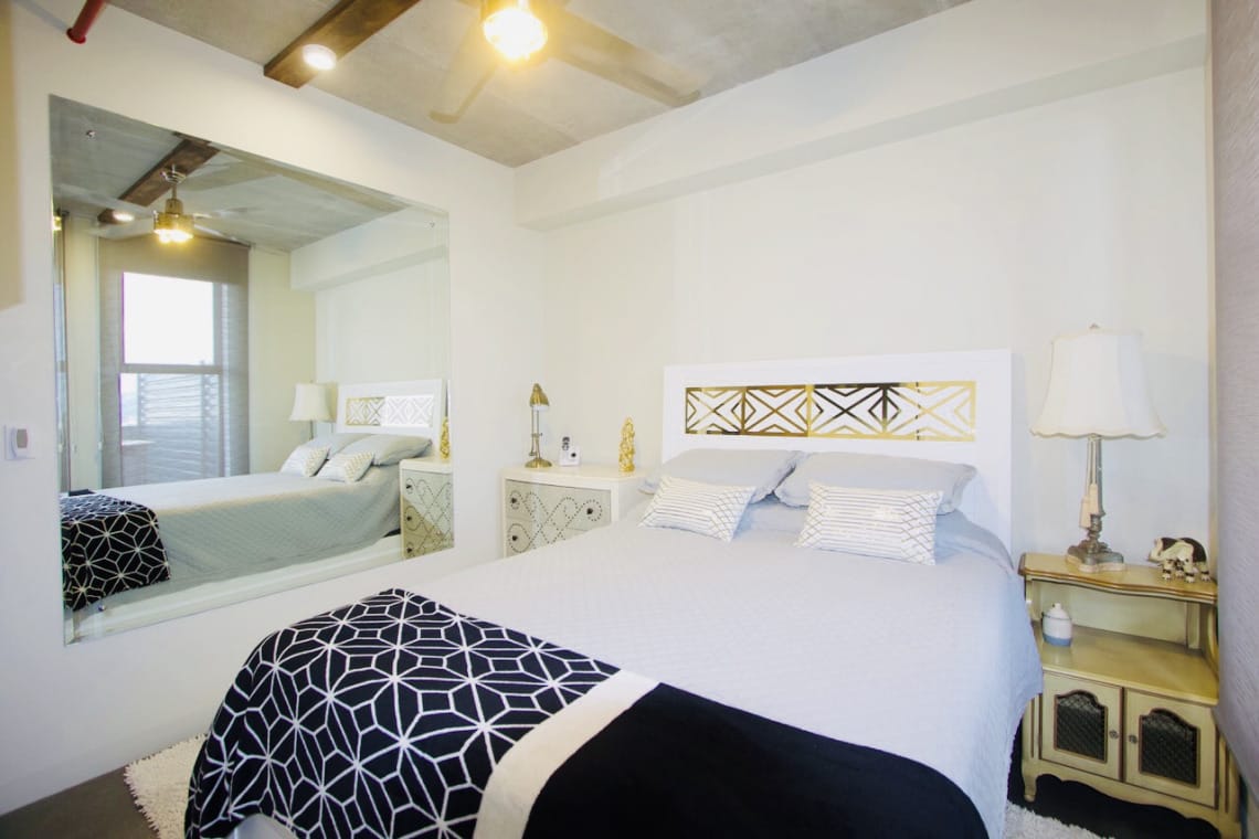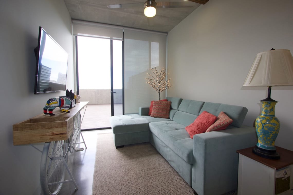 Este apartamento está ubicado en el séptimo piso, con increíbles vistas al oeste de San José y a las montañas, espectaculares puestas de sol!! Tiene una terraza abierta de 36m2 (377SF). Como ningún otro condominio de 1 habitación disponible para alquilar en el edificio URBN Escalante, ya que solo el séptimo piso tiene condominios con amplias terrazas. Una habitación separada con la mejor decoración vintage / moderna, televisión por cable, WIFI, armarios grandes, espejo gigante y ventiladores industriales.