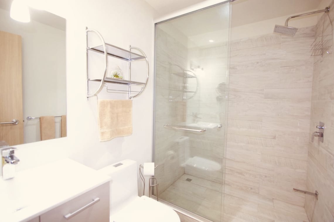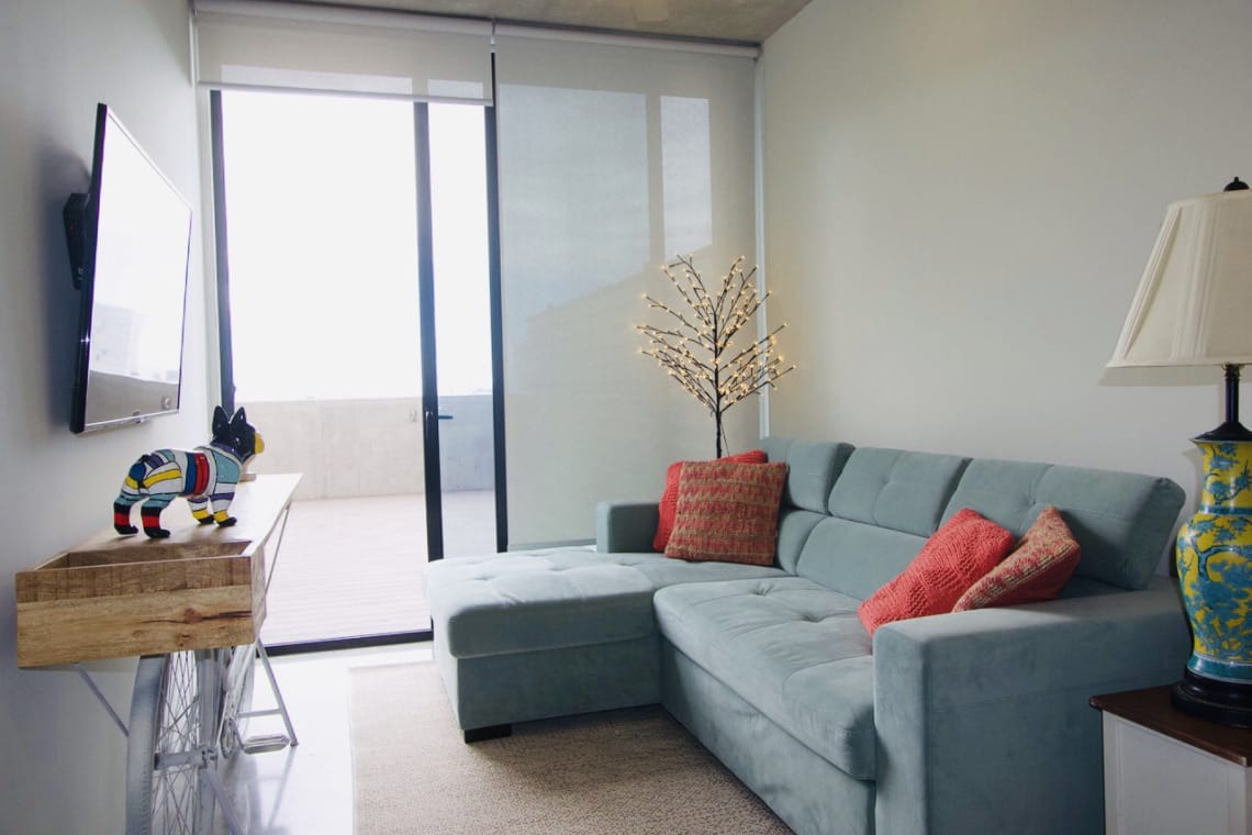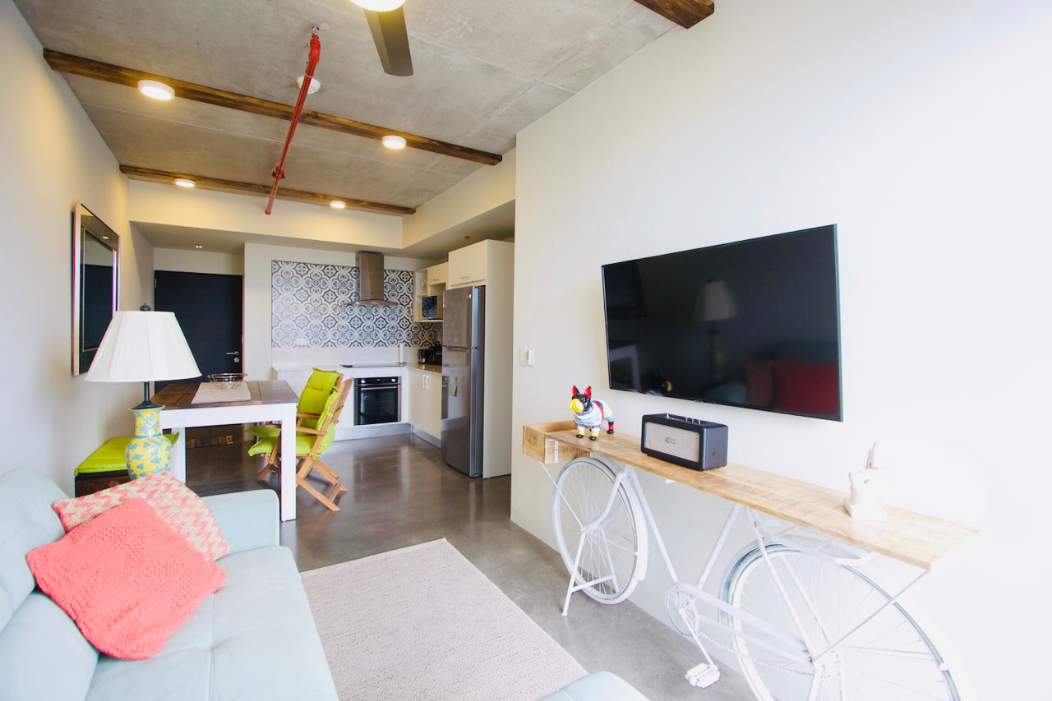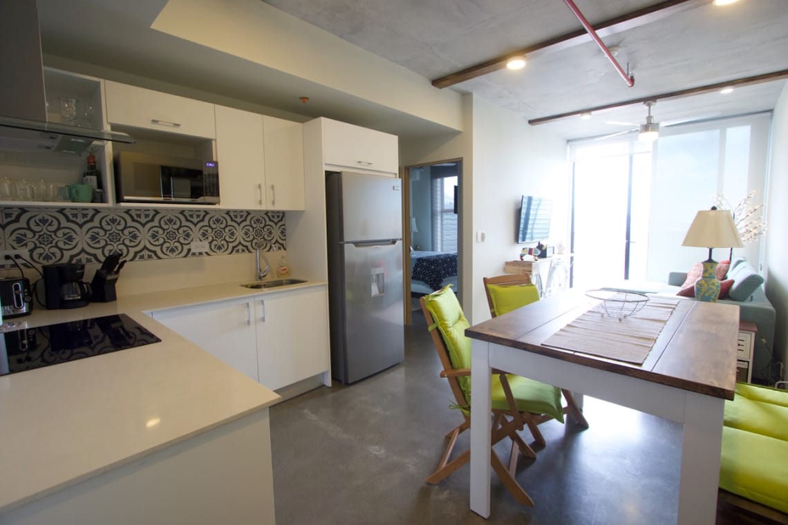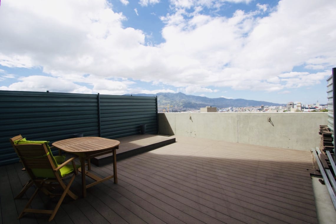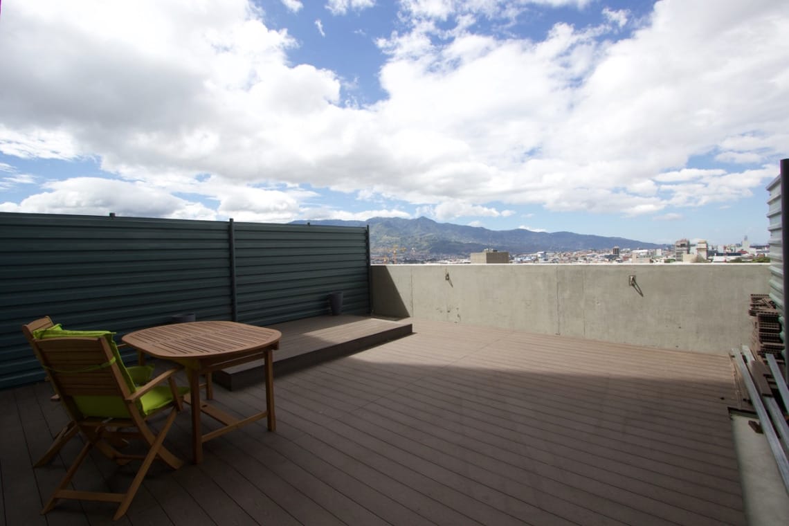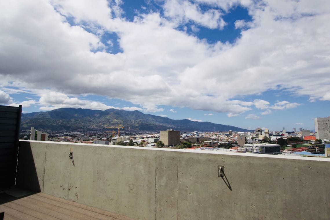 This apartment is located on the seventh floor, with incredible views to the west of San José and the mountains, spectacular sunsets. It has an open terrace of 36m2 (377SF). Like no other 1-bedroom condo available to rent in the building, as only the seventh floor has condos with spacious terraces. A separate room with the best vintage / modern decor, cable TV, large closets, giant mirror, and industrial fan.
