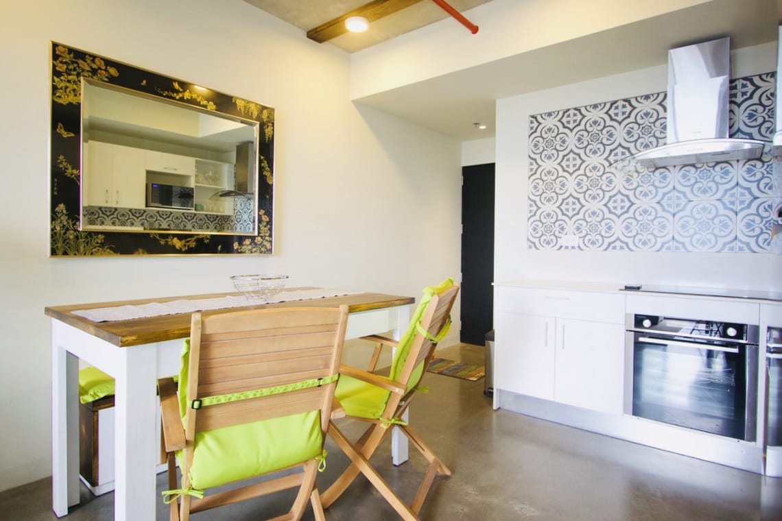 Cocina totalmente equipada, sala de estar con ventilador de control remoto y comedor para 4 personas o más.