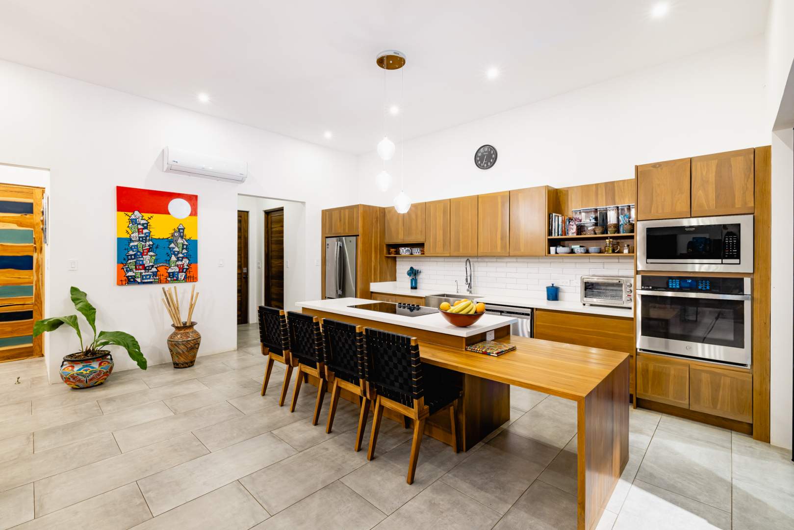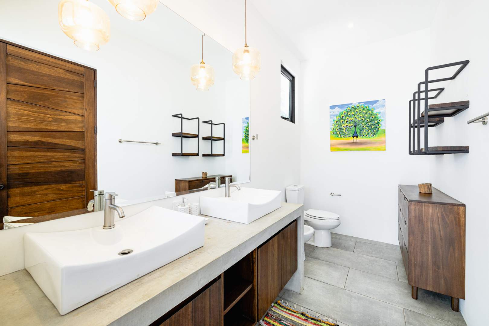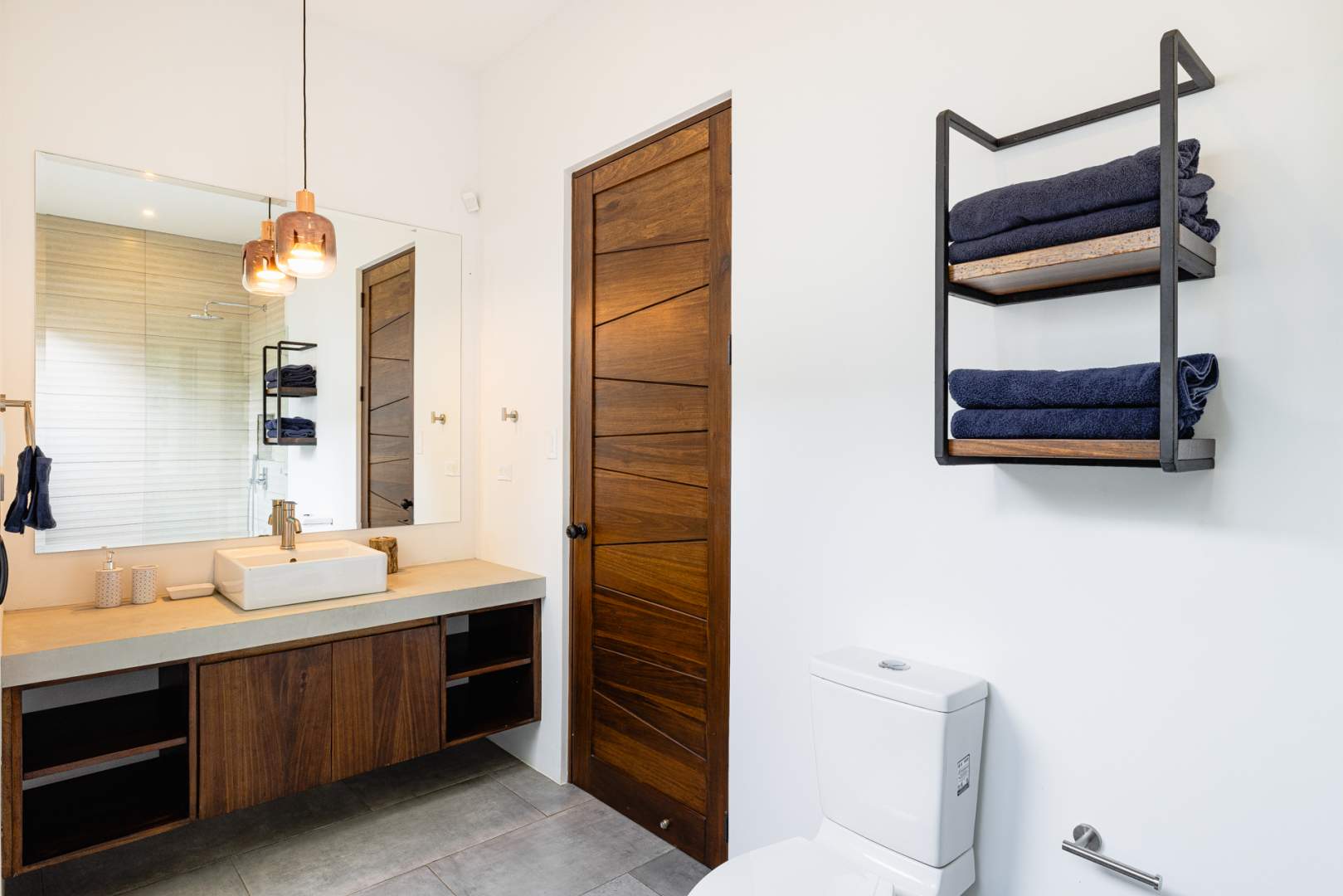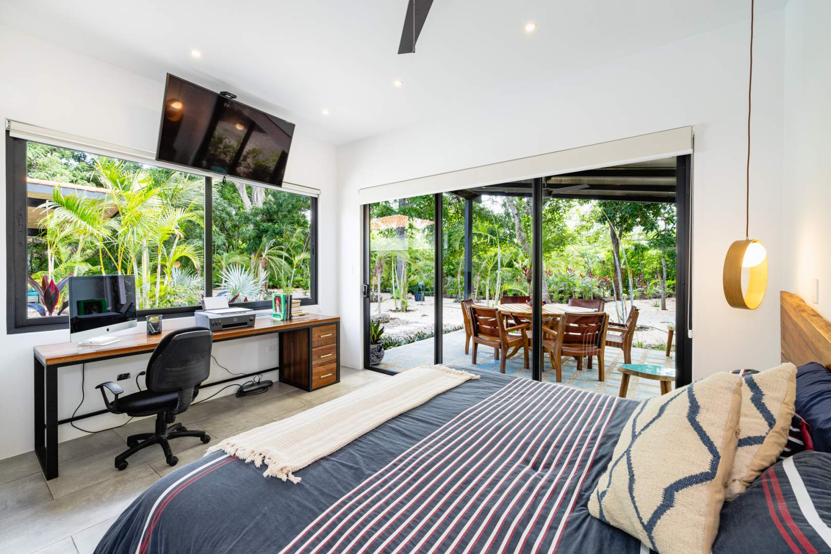 The professional kitchen includes quartz countertops, native hardwood cabinets, a single deep bar sink, and stainless steel GE appliances. The principal 3,300 sq. ft. home features 3 bedrooms flanked on the west side and spa-like indoor / outdoor garden showers in all bathrooms. The master bedroom has a spacious walk-in closet and interlocking glass-sliding doors which view the pool and mature garden. The hardwood, solid-core Laurel doors were custom made for this residence and extremely durable through Guanacaste’s dry and wet seasons. Furthermore, a multi-use “Bonus Room” is behind the garage door with the same porcelain tile as the interior, is air conditioned, and could function as the property’s 5th bedroom, a game room, covered