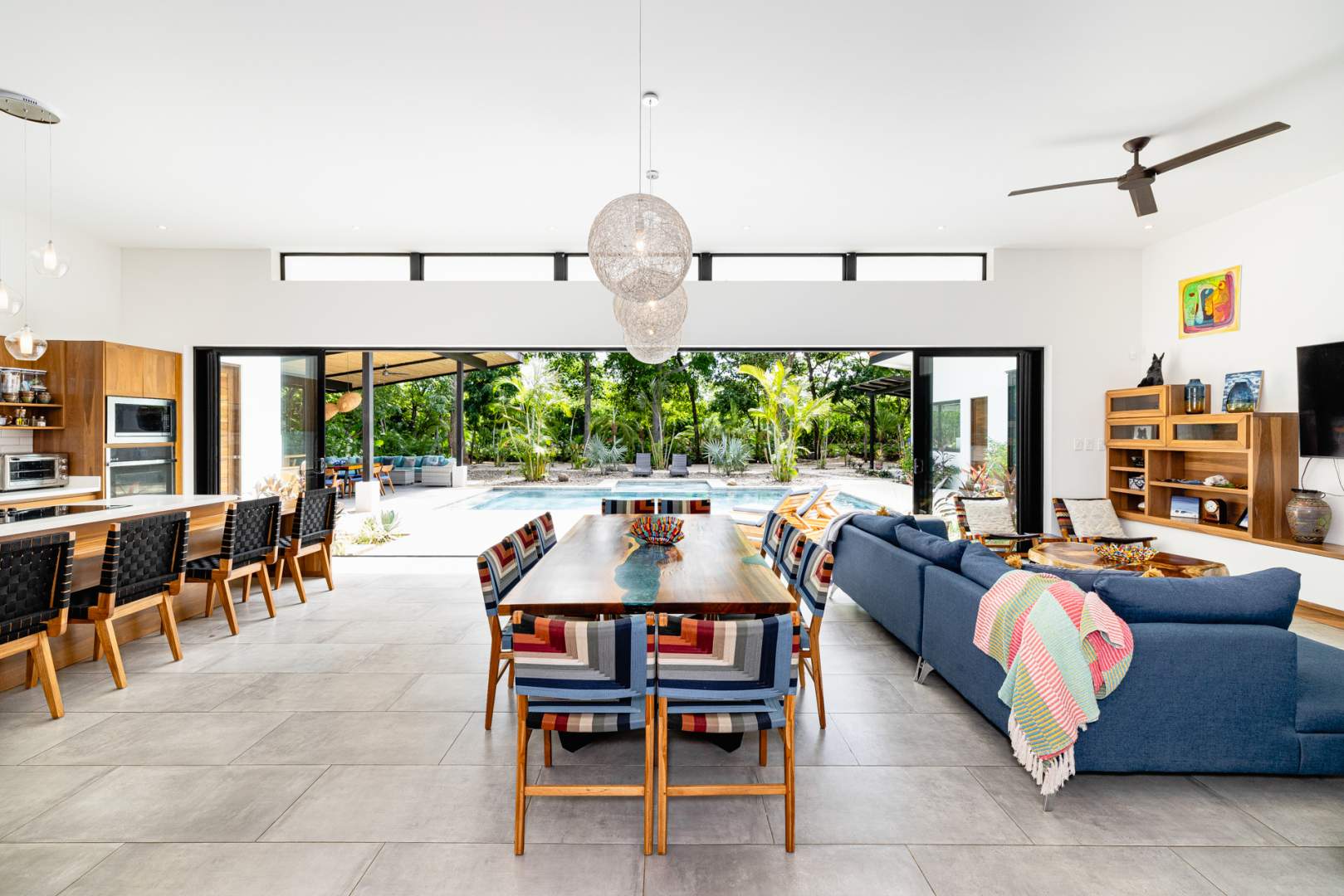The entrance of Villa El Encanto speaks to its uniqueness and charm. A brilliant, oversized Teak and Laurel hardwood door with a turquoise resin sets a welcoming and playful tone as it reveals the spacious, indoor/ outdoor floor plan with custom wood furniture and colorful décor. The magnificent dining room with a large Guanacaste wooden table and resin fill enjoys the authentic Masaya woven chairs from Nicaragua.